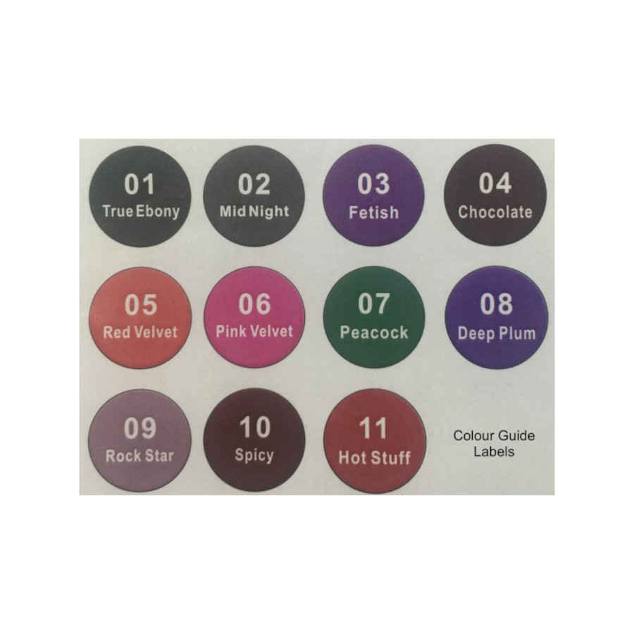 01 True Ebony, 02 Mid Night, 03 Fetish, 04 Chocolate, 05 Red Velvet, 06 Pink Velvet.